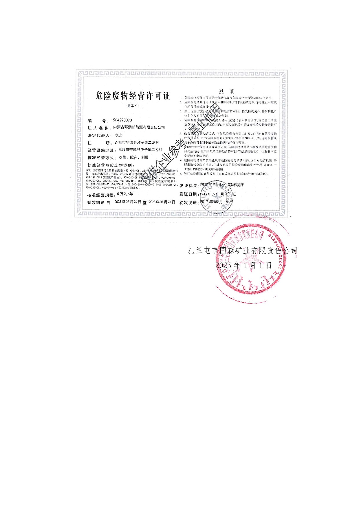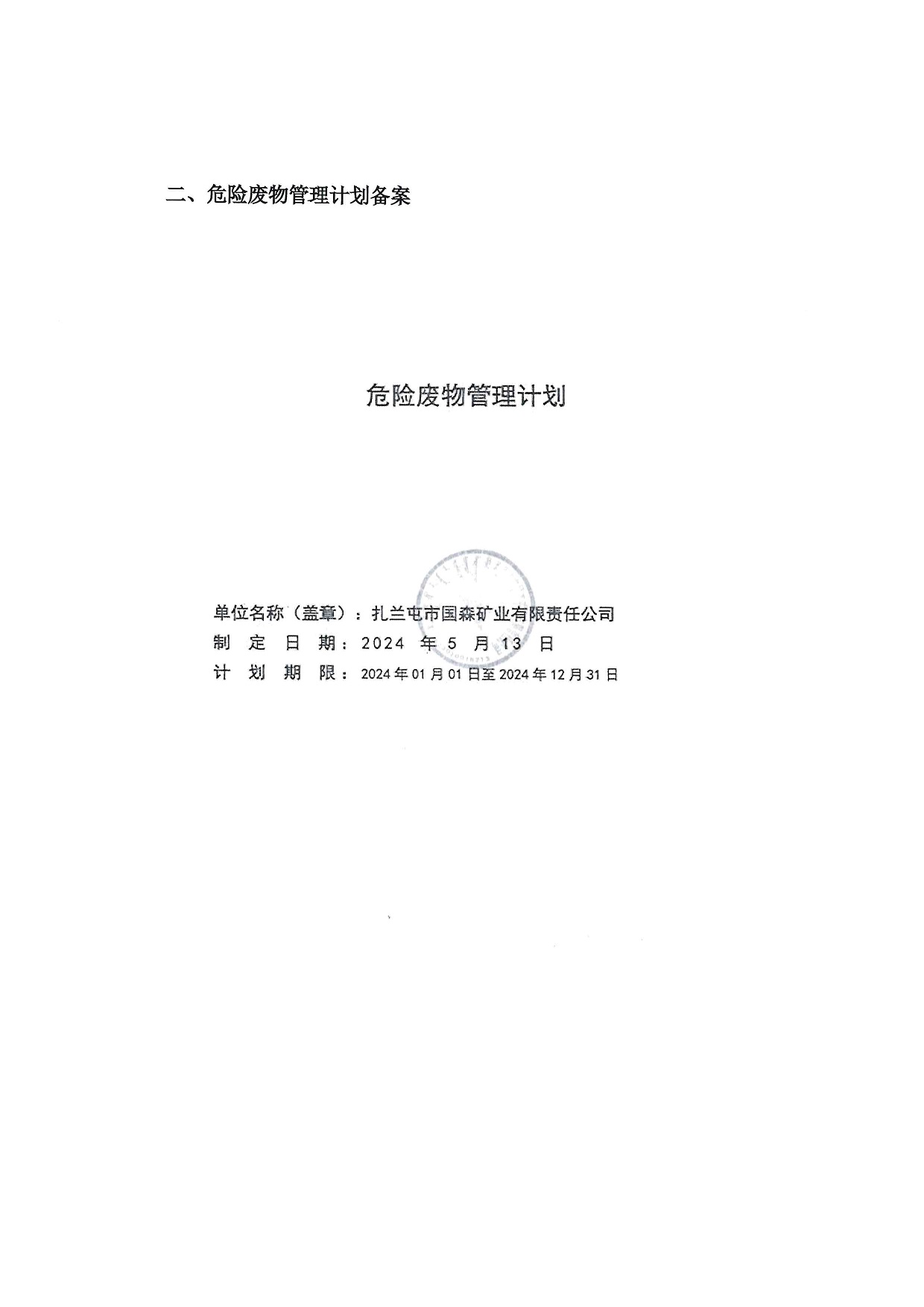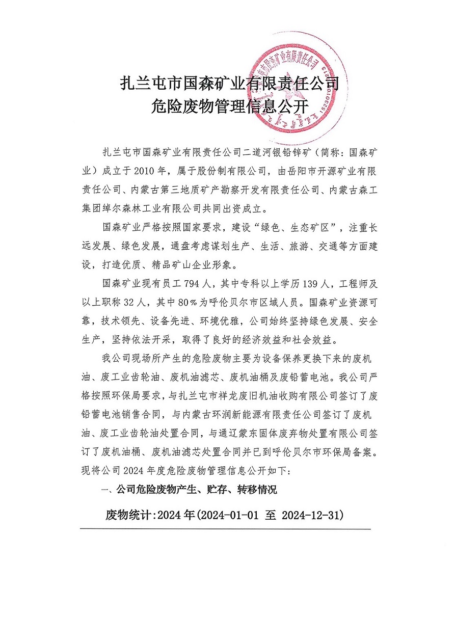 扎蘭屯市國森礦業(yè)有限責任公司危險廢物管理信息公開