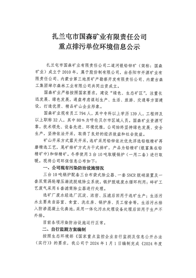 扎蘭屯市國(guó)森礦業(yè)有限責(zé)任公司重點(diǎn)排污單位環(huán)境信息公示